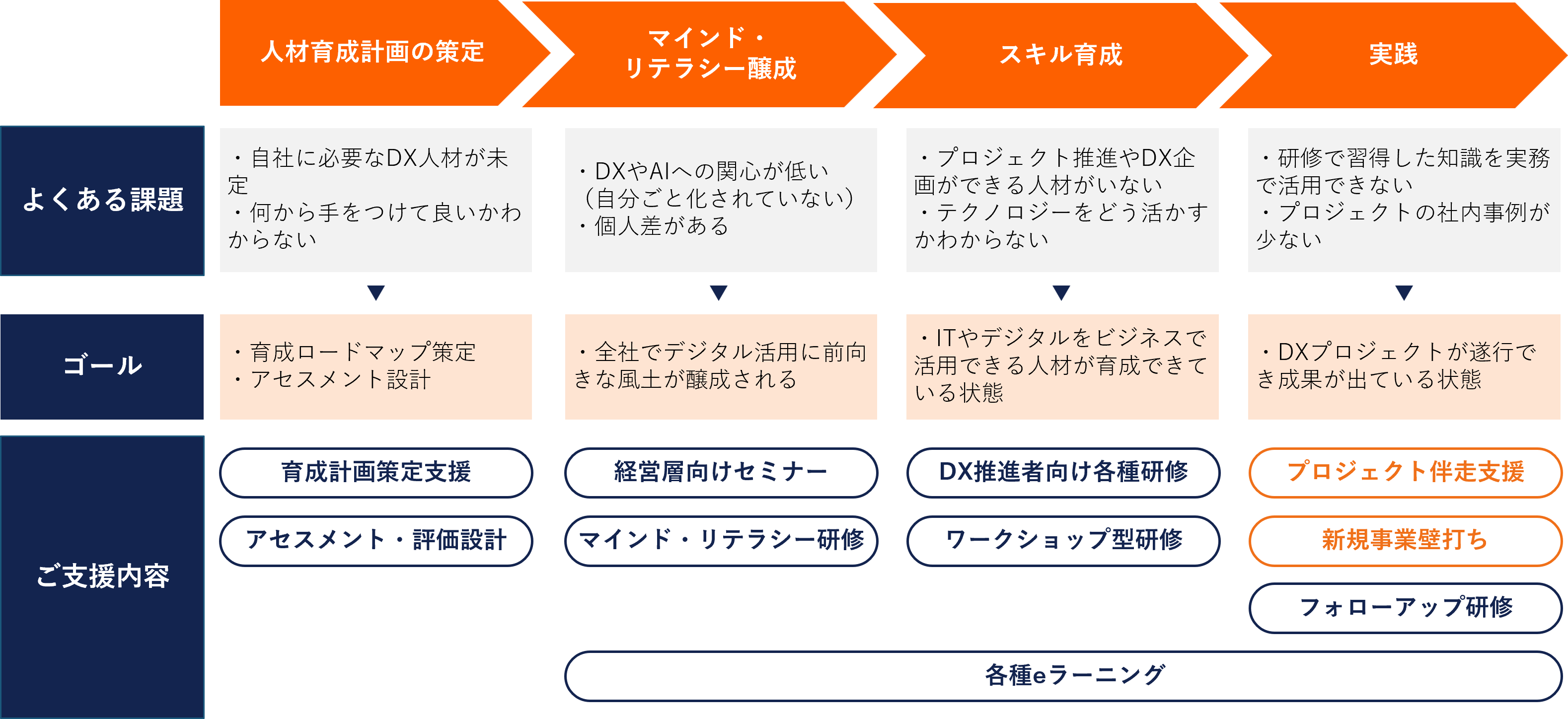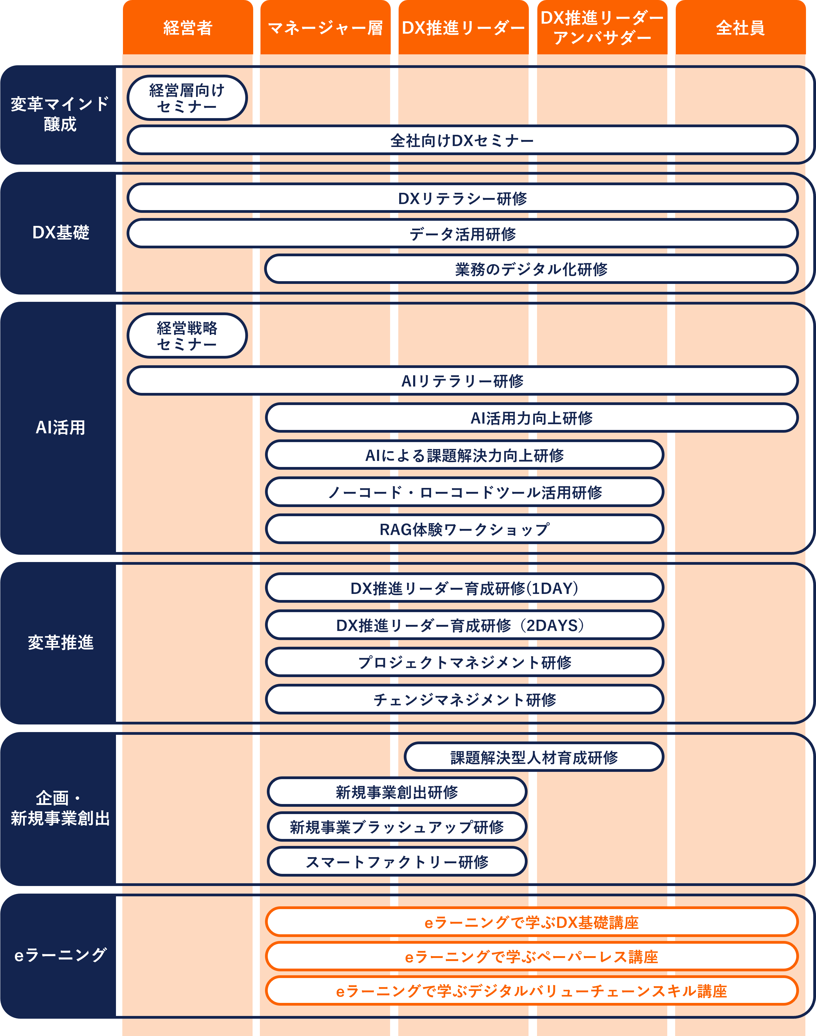経験者から特定部門向けまで網羅した豊富なDX研修カリキュラムを用意。