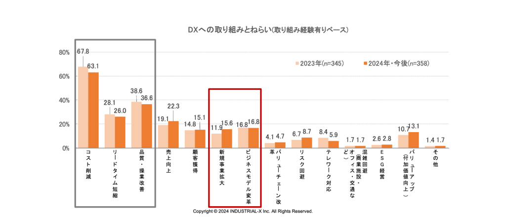 DXによる産業構造変革を推進する株式会社INDUSTRIAL-X(本社:東京都港区、代表取締役CEO:八子 知礼、以下INDUSTRIAL-X)は、「DX推進における課題と意向調査 2024年」を行いましたので結果をお知らせいたします。本調査は、現在(2024年6月)と昨年上半期(2023年4月〜9月)の状況を比較することで、企業におけるDX推進状況の変化を明らかにし、企業経営に資するデータを提供することを目的に実施しました。![]()