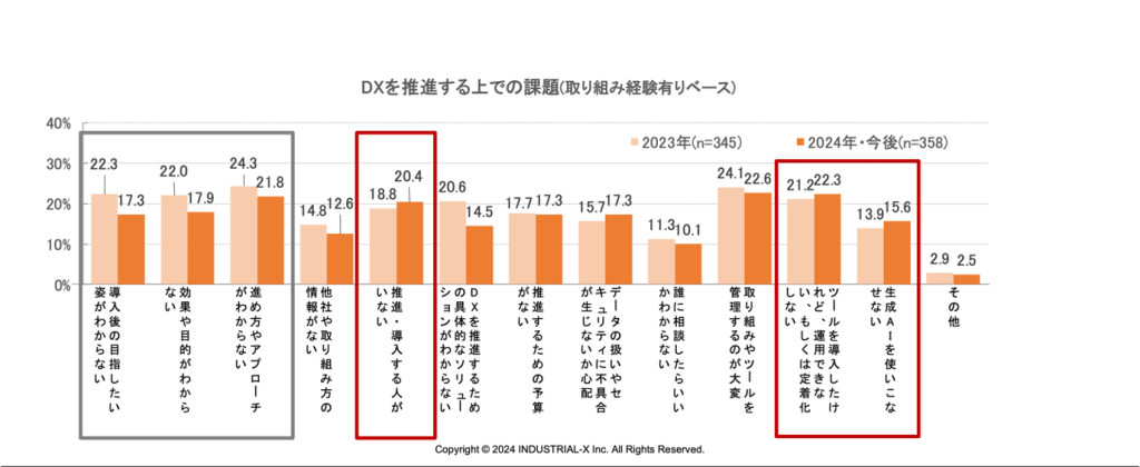 ■DXを推進する上での課題:「推進・導入する人がいない」20.4%、「ツールを導入したけれど、運用できない、もしくは定着化しない」22.3%、僅かながら増加傾向
