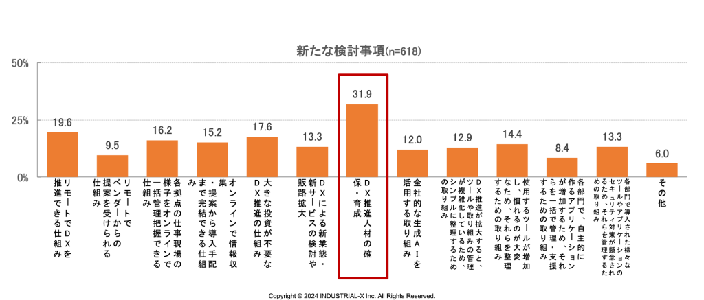 今後の新たな検討事項は、昨年同様「DX推進人材の確保・育成」31.9%、「リモートでDXを推進できる仕組み」19.6%、3位は「大きな投資が不要なDXの仕組み」17.6%となりました。「DX推進人材の確保・育成」が昨年同様、最多となり、DX人材の確保・育成が難航していることが伺えます。3位は「大きな投資が不要なDXの仕組み」17.6%となり、資本力に格差が出やすい中堅・中小企業でも実践可能なDX推進に関心を抱いているようです。