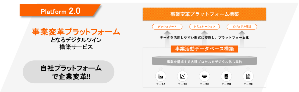 デジタル化をはじめ、広範なIoT導入やデジタルツインの活用により、バリューチェーンのデジタル化など、複数部門に関わる企業の業務をつなげ、企業や自治体の事業変革を実現するプラットフォーム構築します。