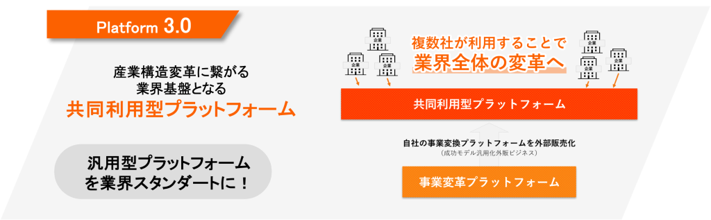 企業や自治体にて構築した事業変革プラットフォームを、独自のリソースとアプローチを掛け合わせ、マーケット全体で有機的に活用できる共同利用型プラットフォームを構築します。