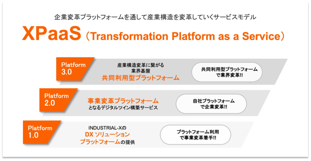 XPaaS(Transformation Platform as a Service)は、INDUSTRIAL-Xのプラットフォーム構想を表した造語であり、プラットフォーム構築を通して企業の変革を支援するサービスモデルです。INDUSTRIAL-Xは、企業が事業モデルを変革するプロセスを体系化し、そのために必要なプロフェッショナルサービス、環境設定、ITサービスを提供する変革プラットフォームカンパニーです。3種類のプラットフォームサービスを構築するサービスを展開することで、「XPaaS (Transformation Platform as a Service)」を確立します。