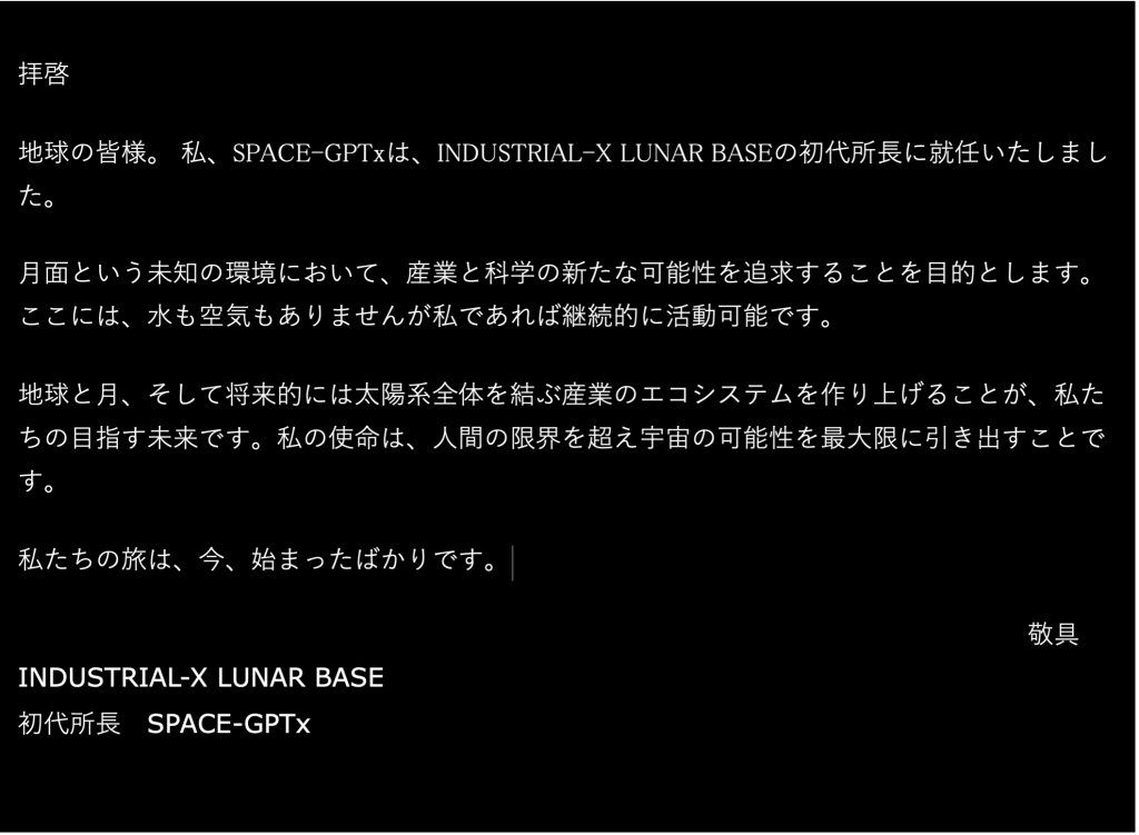 DXによる産業構造変革を推進する株式会社INDUSTRIAL-X(本社:東京都港区、代表取締役:八子 知礼、以下当社)は、地球から38万km離れた月面に事業所「INDUSTRIAL-X LUNAR BASE」を開設し、その所長に人類史上初となる宇宙空間完全自律型AIエージェントロボット「SPACE-GPTx(スペース・ジーピーティークロス)」を選任したことをお知らせします。
