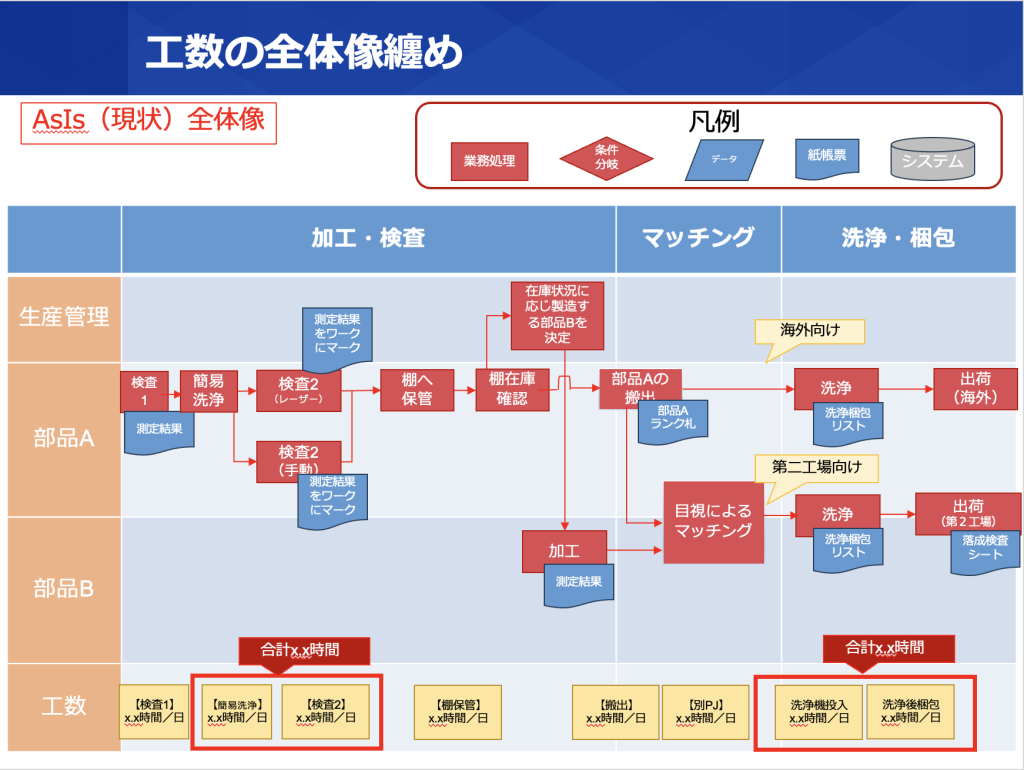自動化設備導入に向け、業務フローや工数の可視化を行い、どの工程にどの程度人手がかかっているかが明らかになった。
